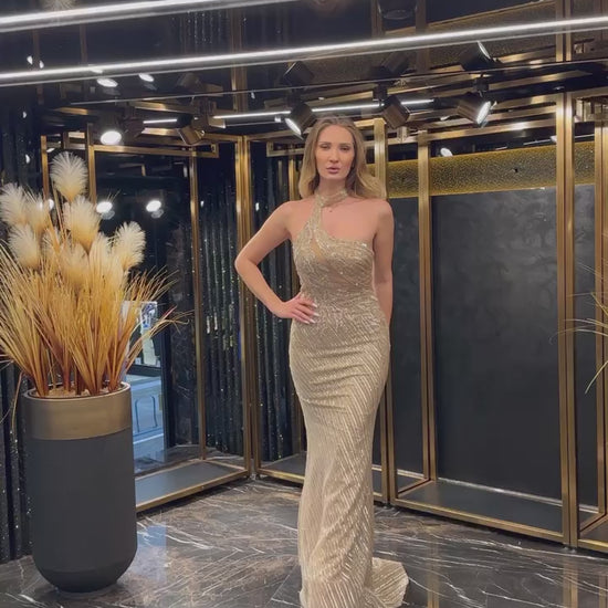 Fitted evening gown tulle embroidered, with deep cheer illusion top and sleeveless high collar design.