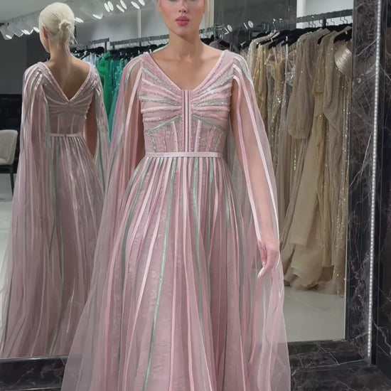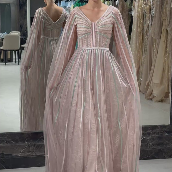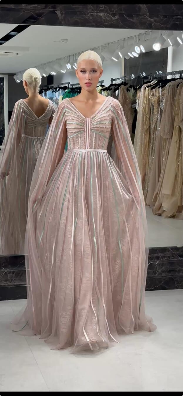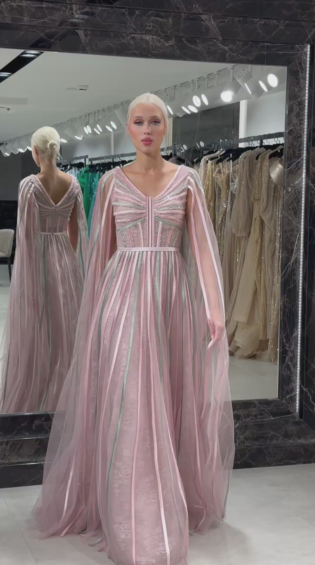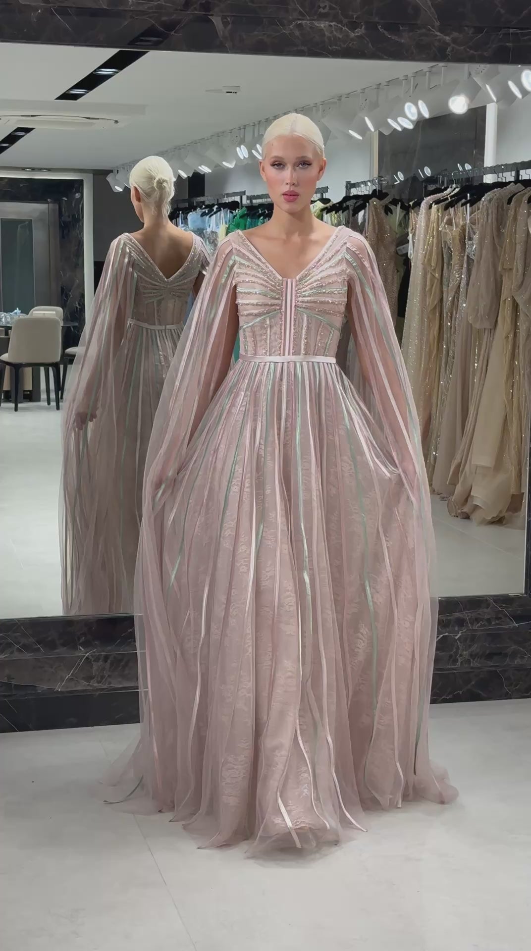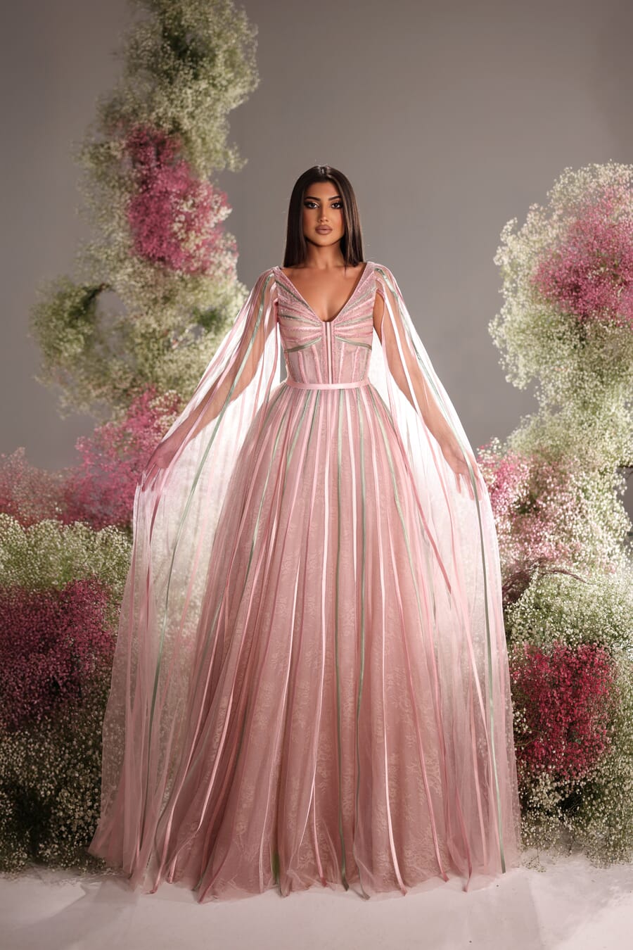 This dress features a daring plunging V-neckline on a fitted, structured bodice. The soft voluminous skirt is detailed with captivating vertical stripes of delicate pink and soft mint green ribbon, adding a unique, playful dimension. Layered dentelle touch with shimmery tulle. The standout feature is the dramatic, sheer floor-length cape that flows from the shoulders, creating an unforgettable, ethereal entrance.