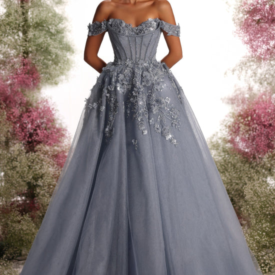 This stunning fairy tale corset ballgown combining romantic volume with sophisticated structure. It features an exquisite off-the-shoulder neckline and a beautifully defined, corset-style bodice that ensures a flattering silhouette. The gown is adorned with intricate shimmering floral and leaf appliqués that cascade gracefully from the waist onto the full, magnificent tulle skirt