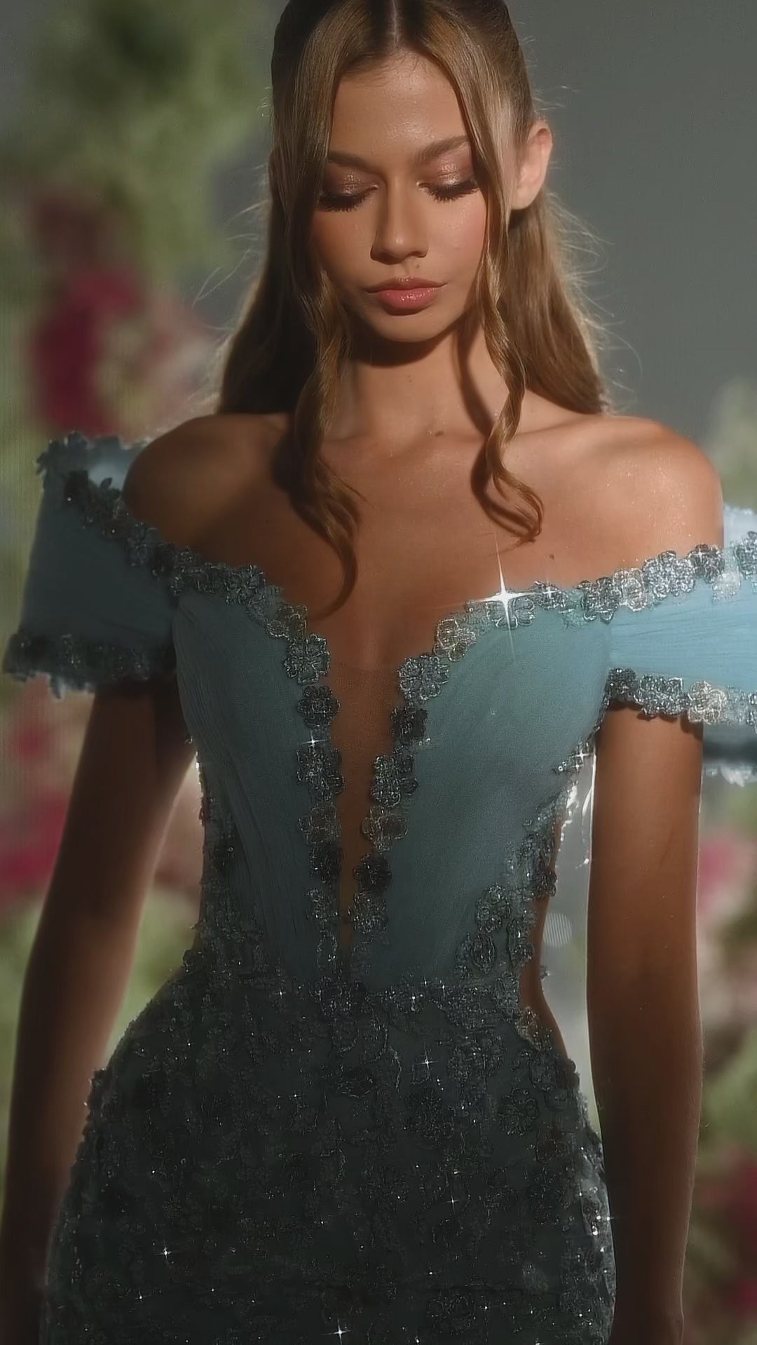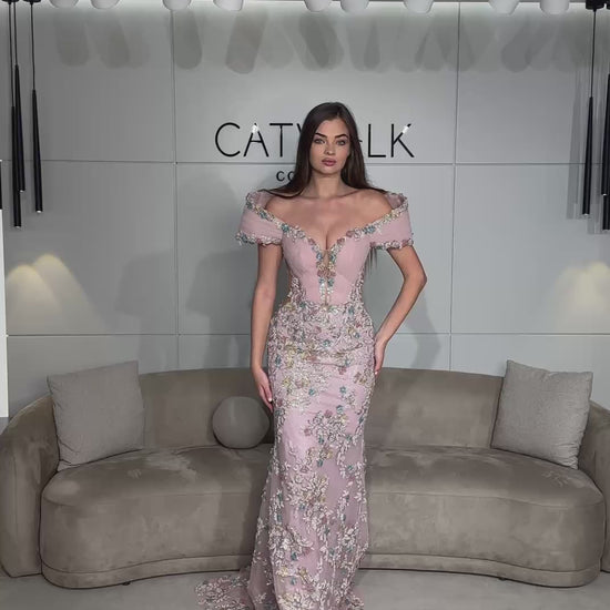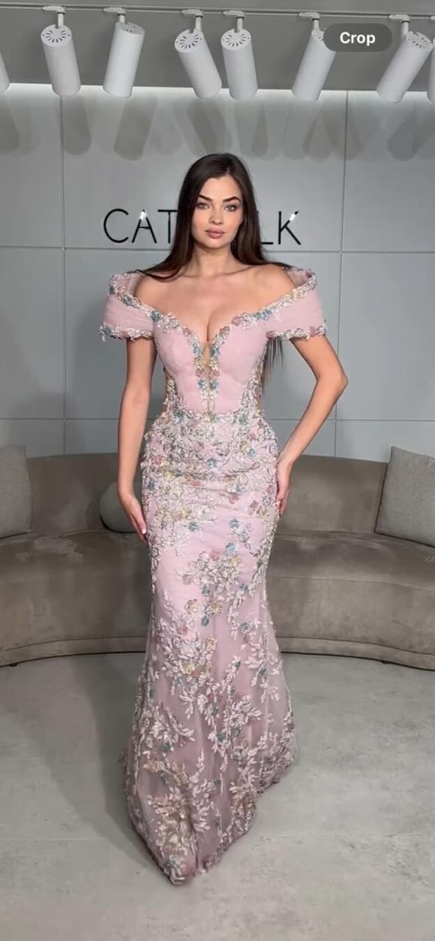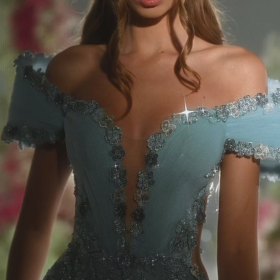 Exude timeless grace in this mermaid gown. This design features romantic off-the-shoulder sleeves and a deep-plunging neckline with illusion mesh. The entire dress is layered with delicate floral lace and silver embroidery, creating a textured, shimmering finish that is both ethereal and glamorous.