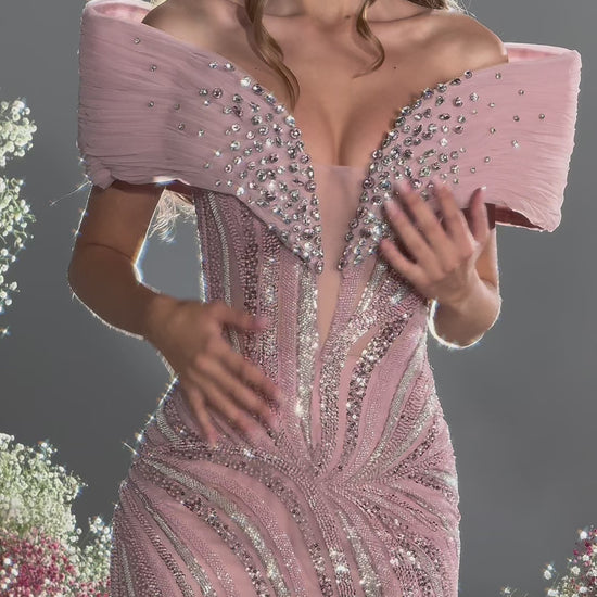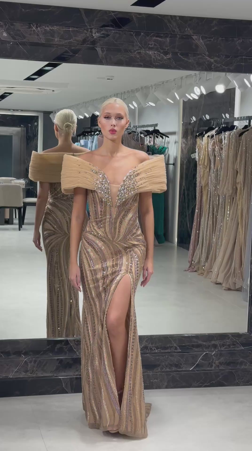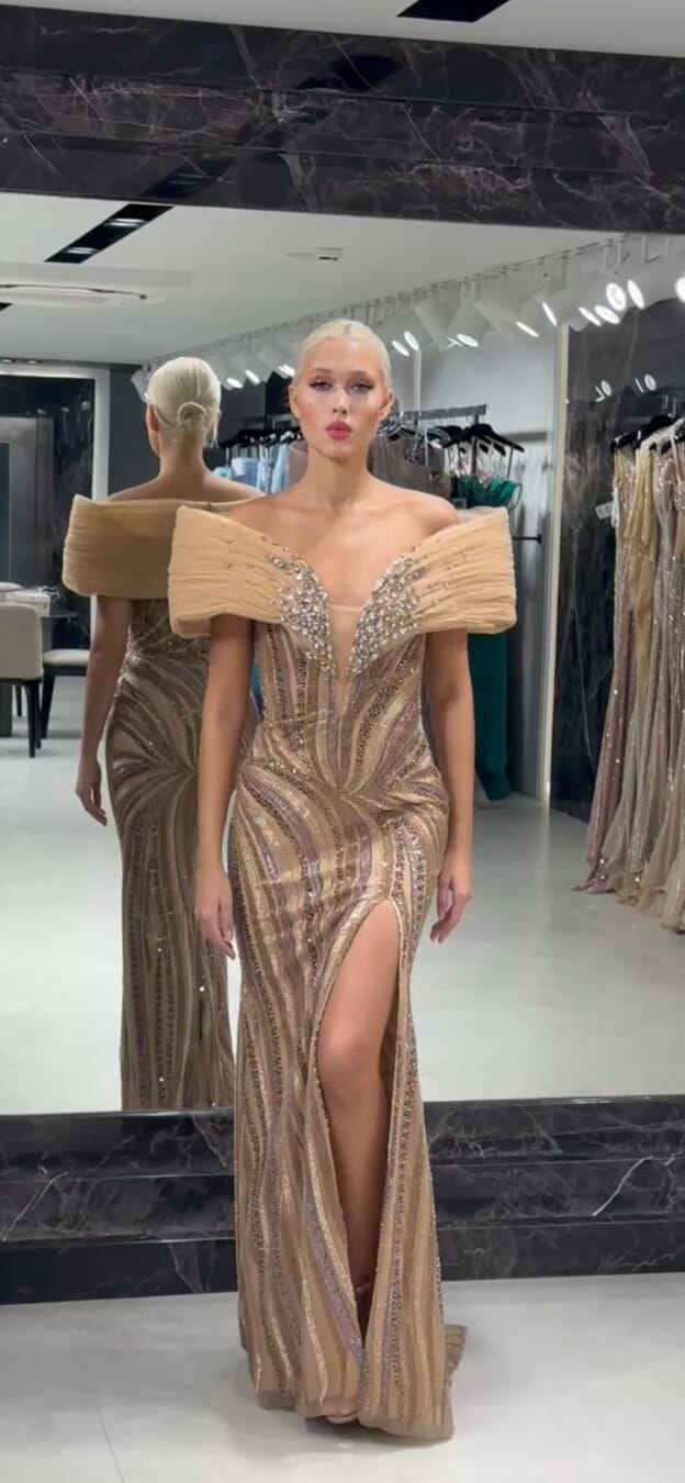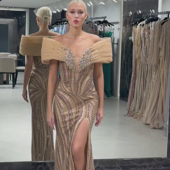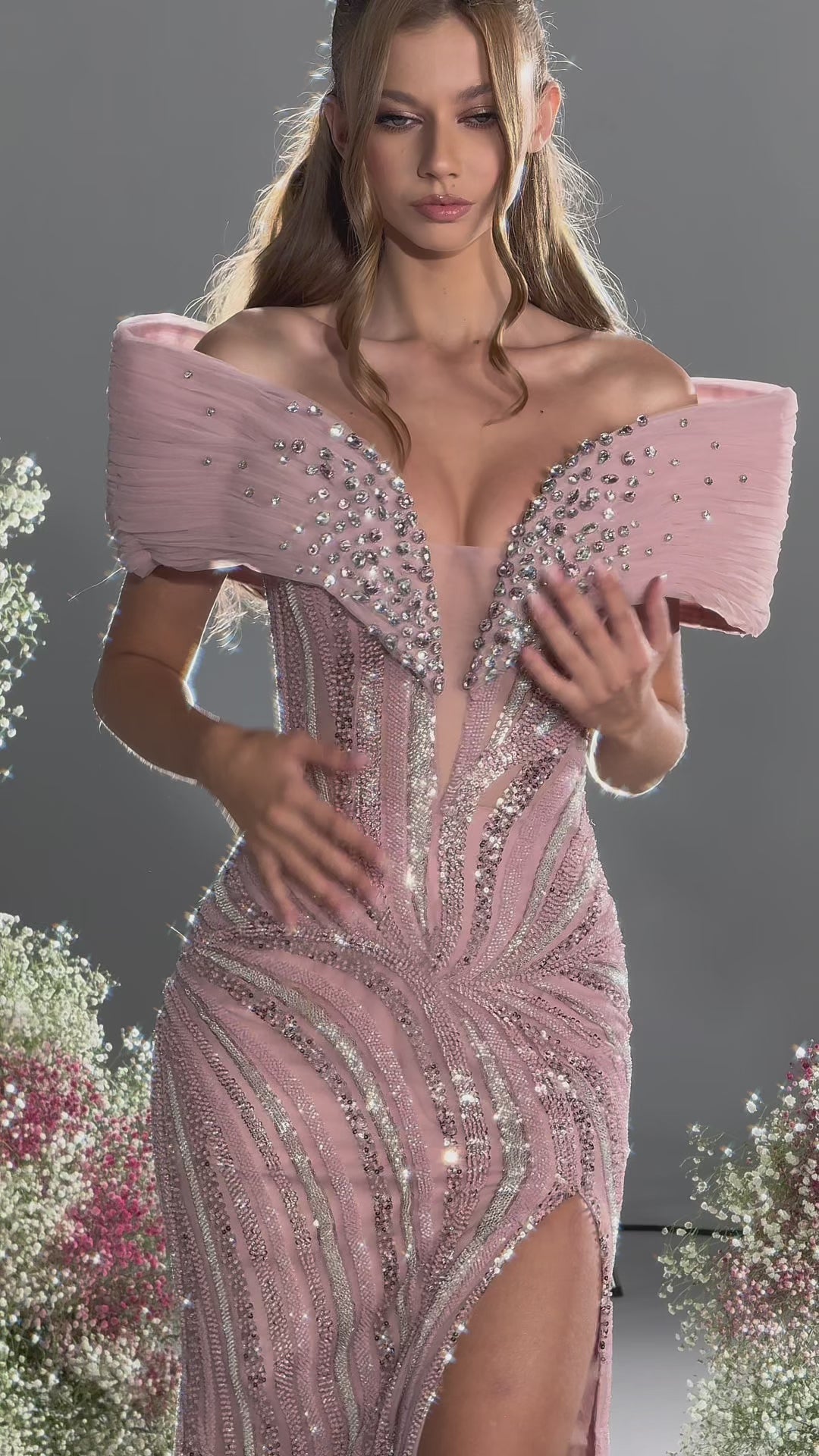 Redefine elegance in this shimmering rose gold gown. This dress features a dramatic, structural off-the-shoulder wrap and a plunging illusion neckline. Sculpted lines of sequins flow down the length of the gown, which is finished with a sophisticated side slit for effortless movement.