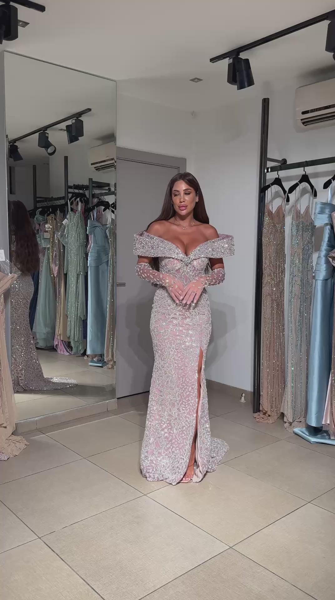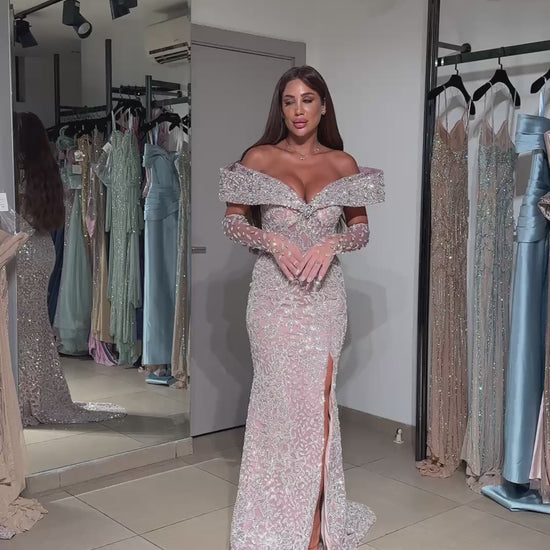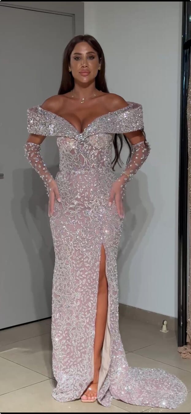 Capture a romantic aesthetic with this mermaid gown. This design features elegant off-the-shoulder sleeves and a deep-plunging illusion front. The entire gown is richly embellished with lace and silver embroidery, creating a textured, multi-dimensional finish.