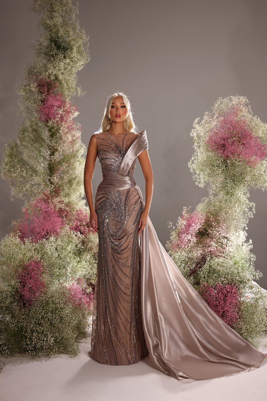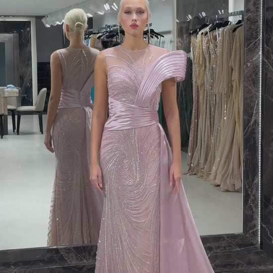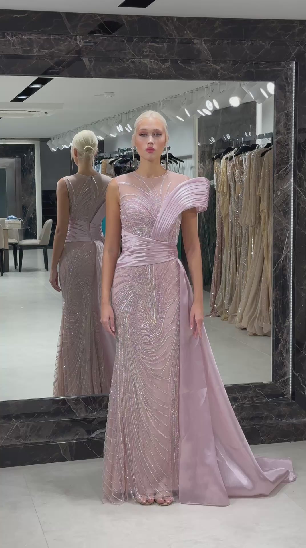 A vision of contemporary couture, this mermaid gown artfully combines sculptural architecture with ethereal shimmer. The design features a plunging illusion neckline and an avant-garde, structured shoulder wrap that creates a dramatic, high-fashion focal point. Intricate, swirling patterns of shimmering sequins flow across the sheer-overlay bodice and skirt, while a voluminous satin side-train adds a sense of movement and red-carpet grandeur.