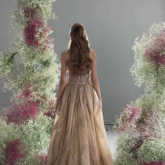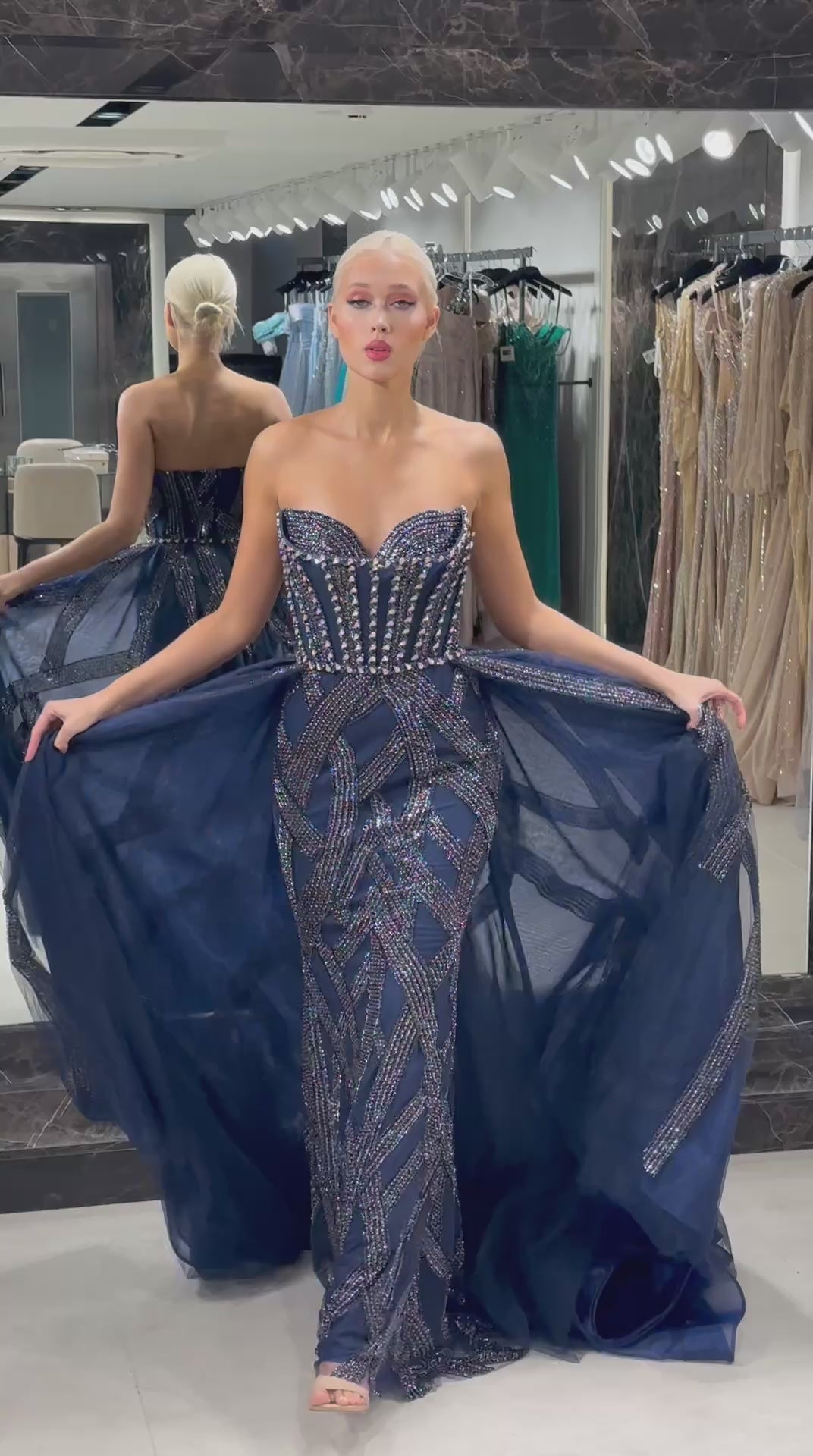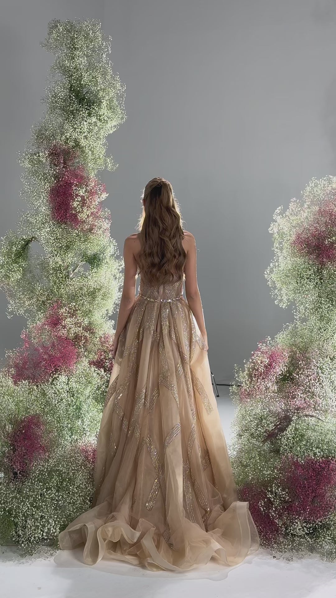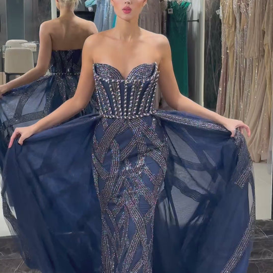 This shimmering couture gown is the ultimate statement in regal glamour, featuring an intricately structured corset bodice with sheer panels and vertical crystal-encrusted boning. The form-fitting mermaid silhouette is adorned with a bold geometric trellis pattern of sequins that catch the light from every angle. The look is elevated to red-carpet status by a voluminous, floor-sweeping overskirt crafted from ethereal gold tulle and finished with a shimmering embellished border.