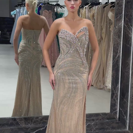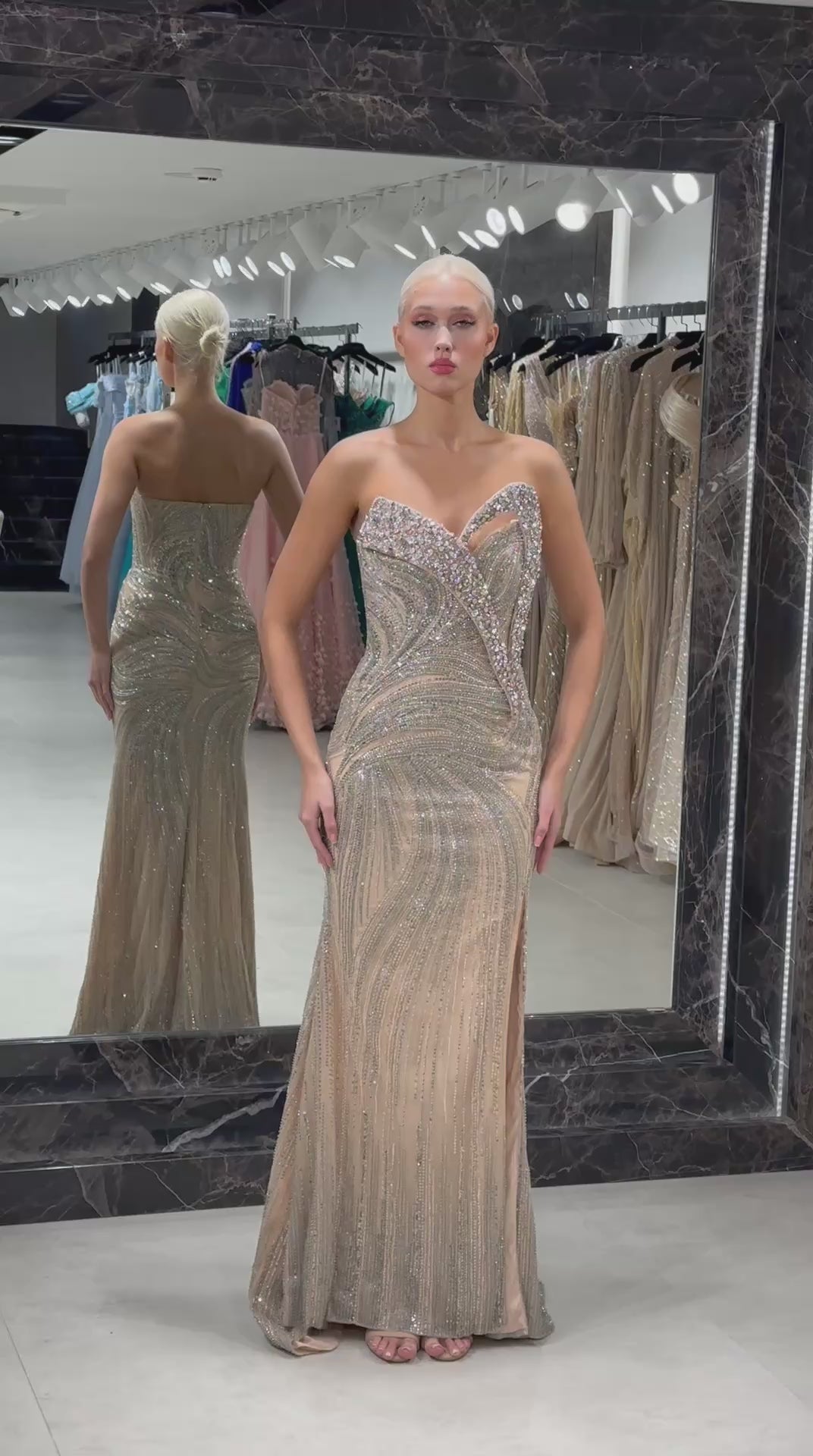 This exquisite rose-gold evening gown is a masterclass in sculptural glamour, featuring a strapless sweetheart bodice with a striking architectural wrap-around detail. The form-fitting silhouette is completely adorned with a mesmerizing pattern of shimmering sequins and light-catching crystals that flow gracefully throughout the entire piece. Finished with a dramatic high leg slit, this gown perfectly blends modern structural design with timeless sparkle.