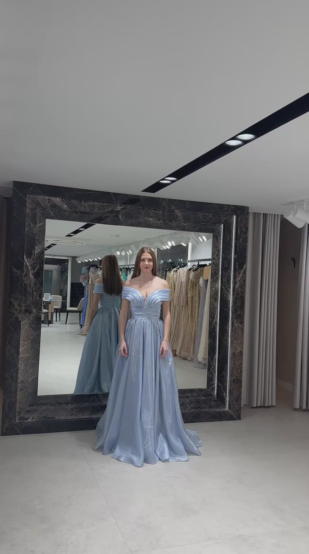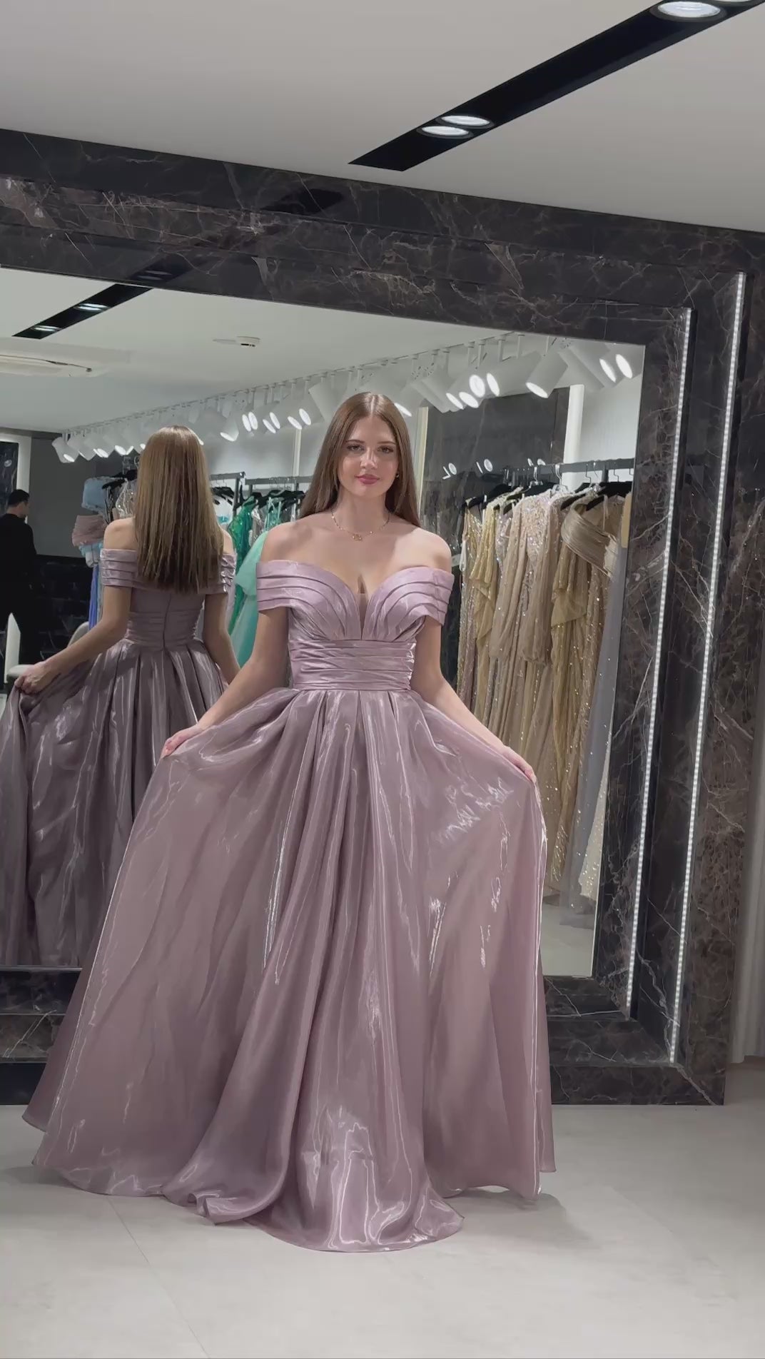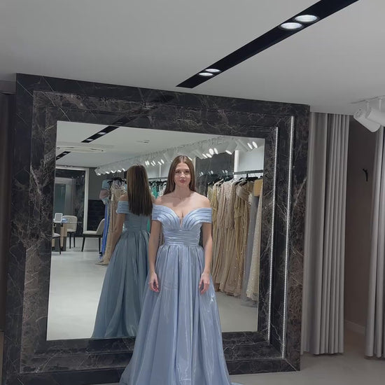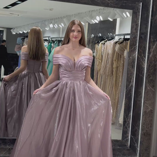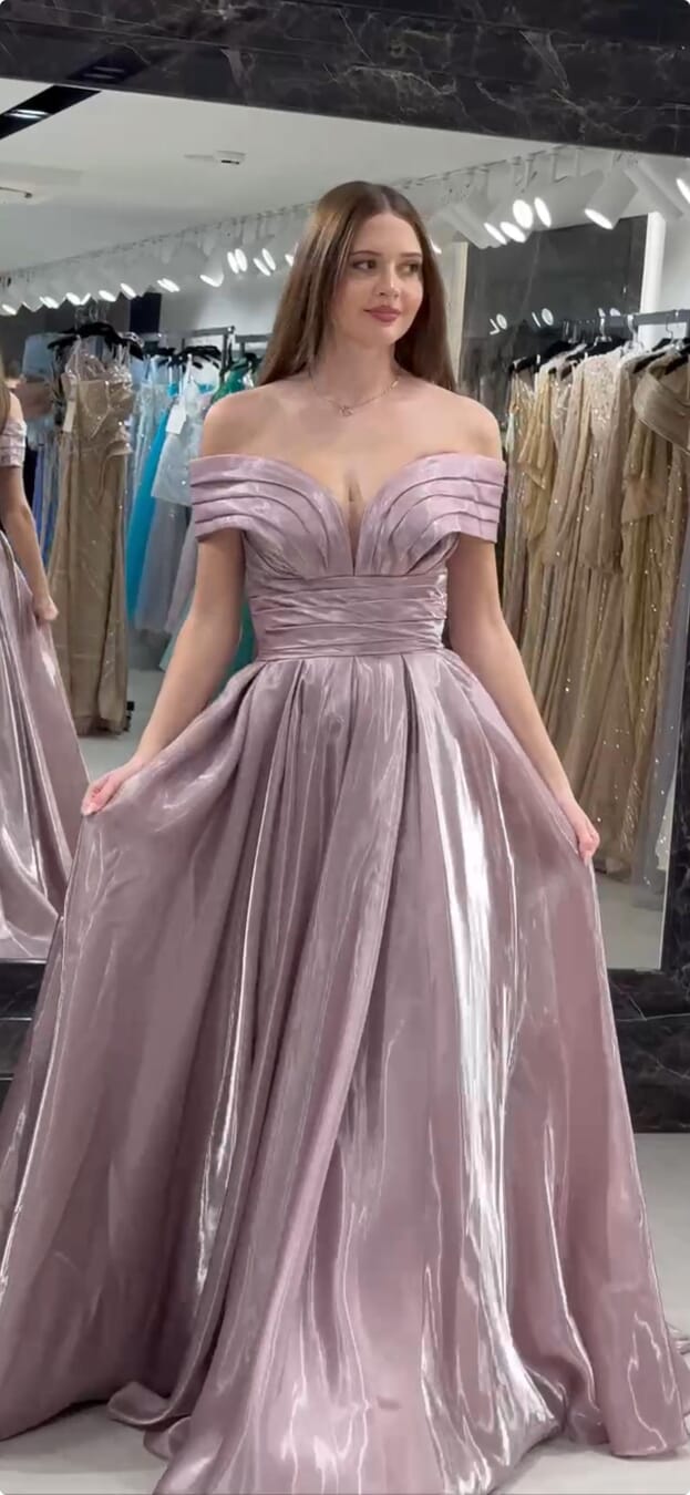 Exude timeless elegance with a modern metallic twist in this ballgown. The design features a dramatic off-the-shoulder neckline with architectural pleating and a daring plunging V-detail that adds a contemporary edge to a classic silhouette. A cinched, wide waistband leads into a voluminous, box-pleated skirt crafted from a high-shine, solid Crystal Mikado fabric that captures and reflects light with every movement.