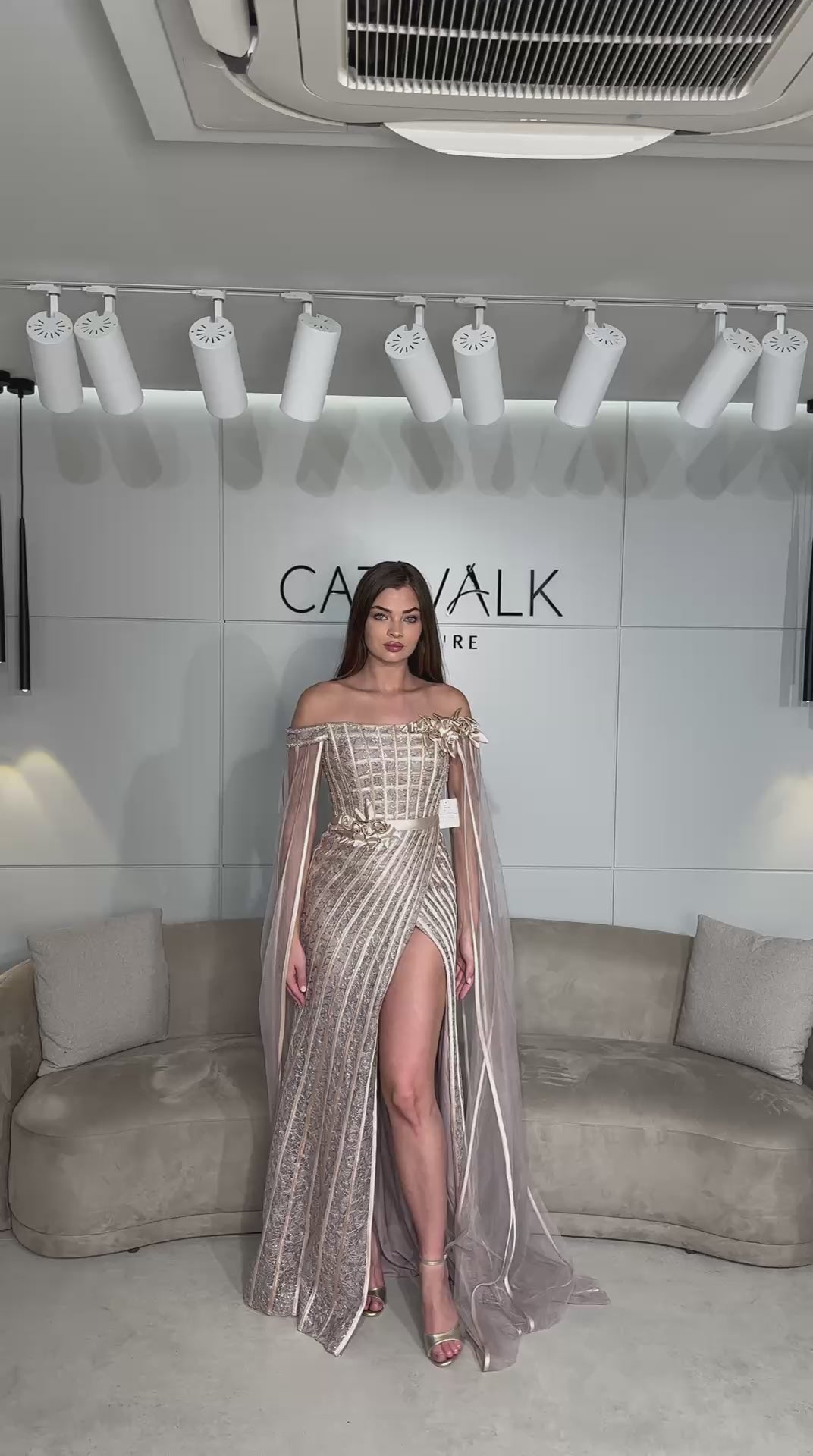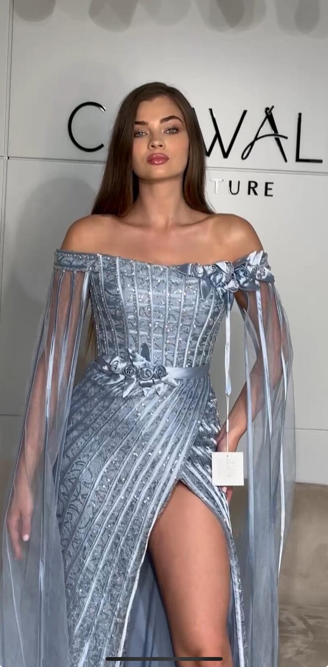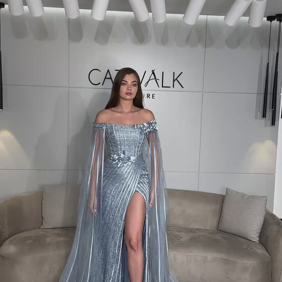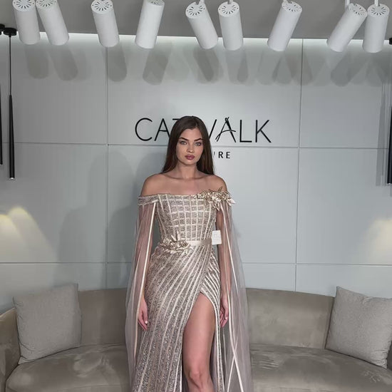 This couture gown is the epitome of ethereal romance, featuring an elegant off-the-shoulder neckline accented by delicate 3D floral appliqués at the shoulder and waist. The bodice showcases a sophisticated geometric grid of sequins, transitioning into a shimmering skirt with vertical stripes that elongate the frame and a bold high leg slit. Completed by dramatic, floor-length sheer cape sleeves.