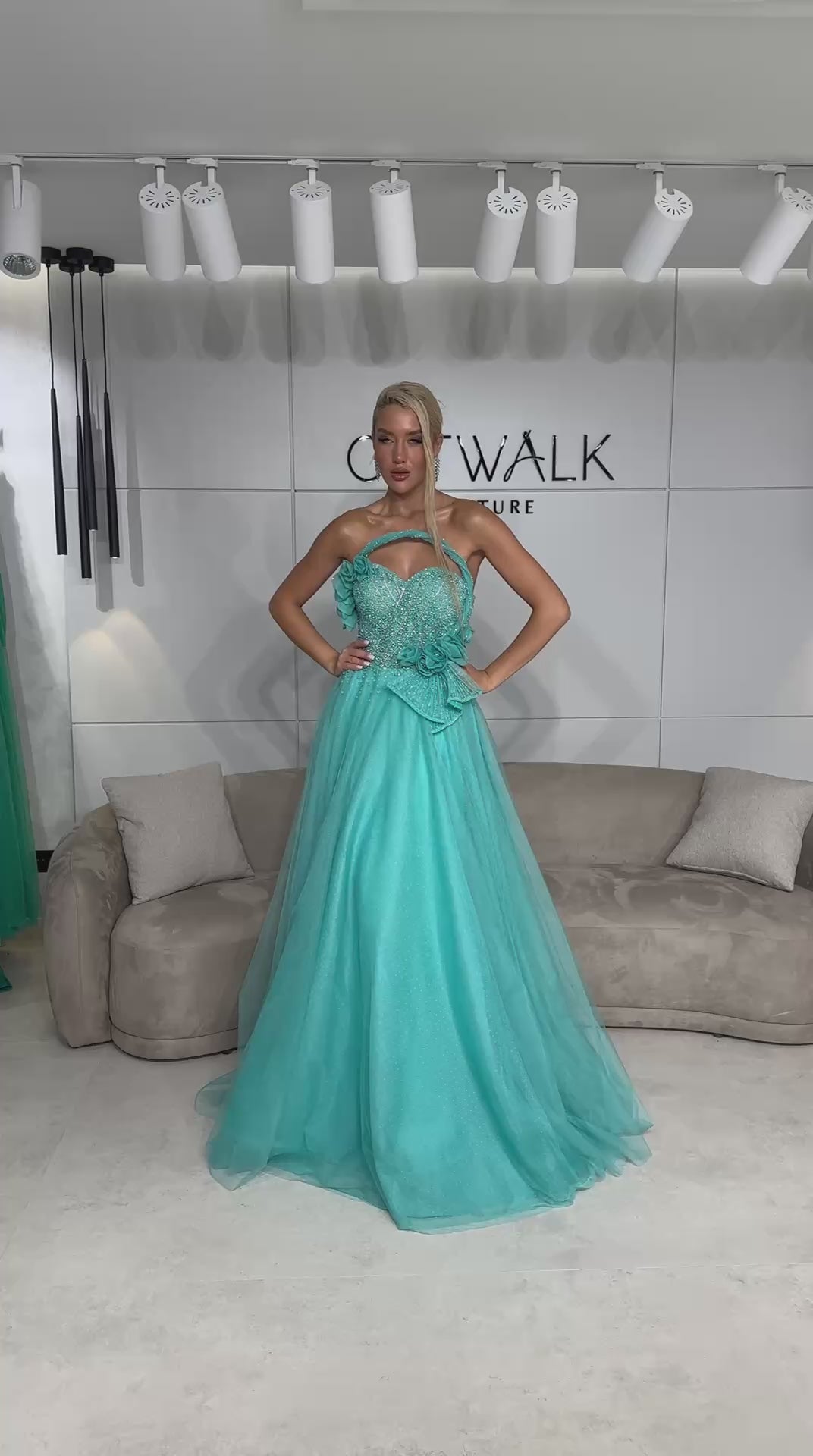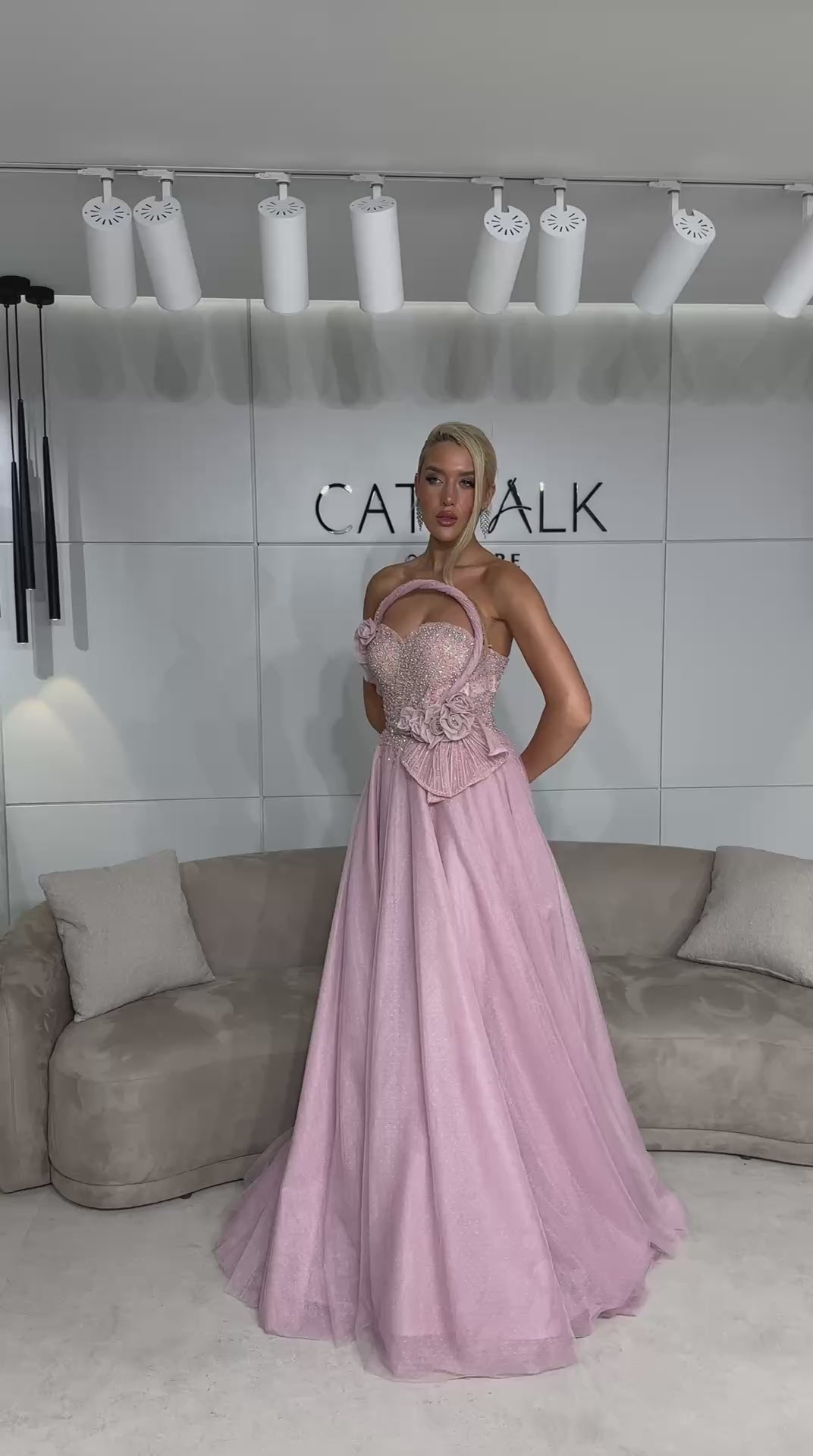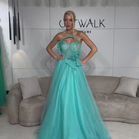 Enchanting and ethereal, this ballgown is a fairytale come to life, designed for a truly magical entrance. The strapless sweetheart bodice is heavily encrusted with shimmering crystals and features a unique sculptural halo-neckline detail that adds a modern, architectural twist. Adorned with delicate 3D floral rosettes at the waist and shoulder, the gown flows into a voluminous, floor-sweeping A-line skirt crafted from dotted dentelle and shimmering tulle.