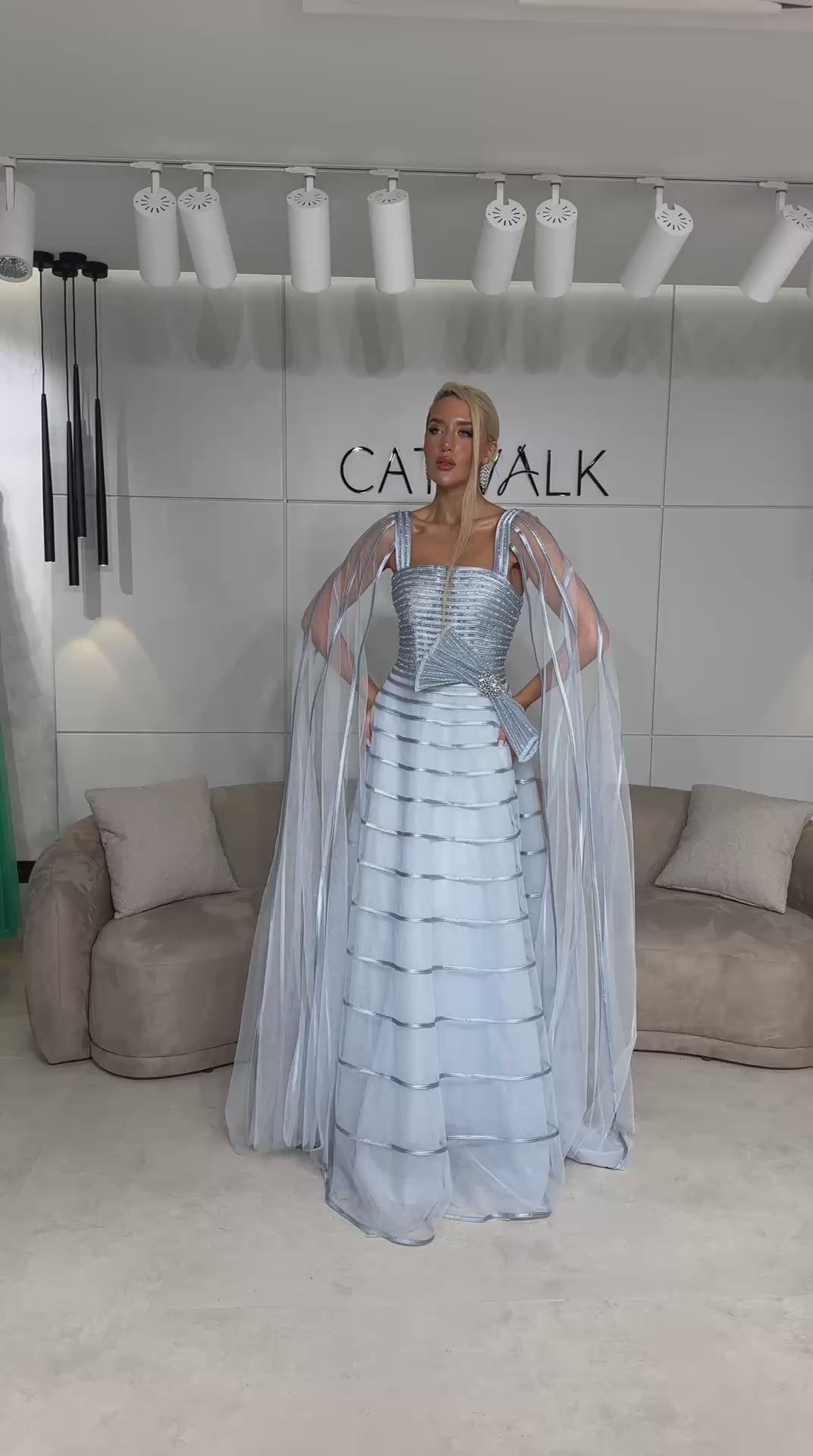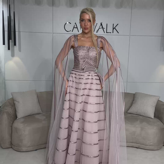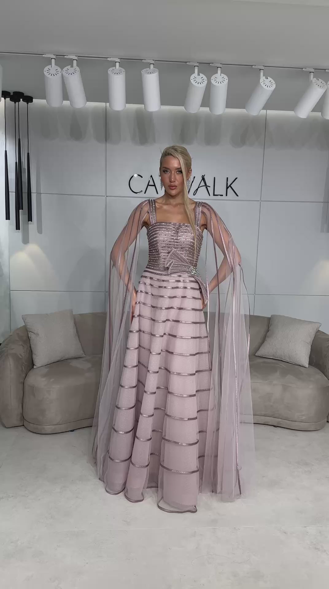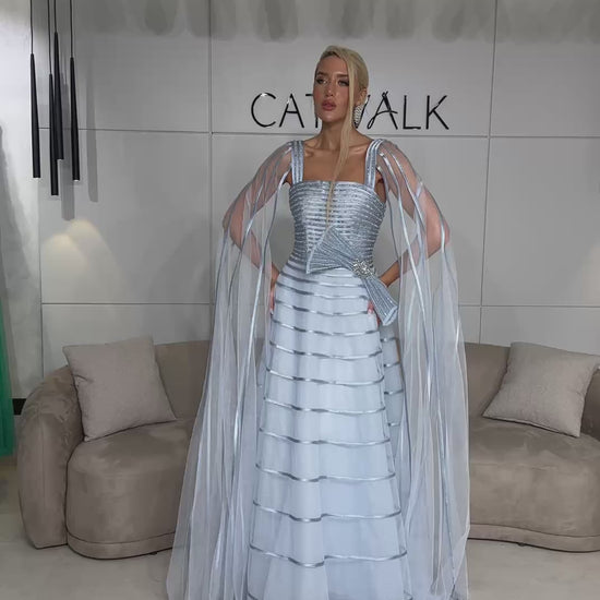 This A-line gown is a vision of modern royalty, featuring a sophisticated square neckline and a structured bodice. The entire silhouette is defined by shimmering horizontal bands that create a rhythmic, architectural texture across the voluminous, floor-sweeping skirt. Completed with ethereal floor-length sheer cape sleeves and a delicate bow at the waist, this ensemble offers a dramatic and regal presence for any high-profile event.