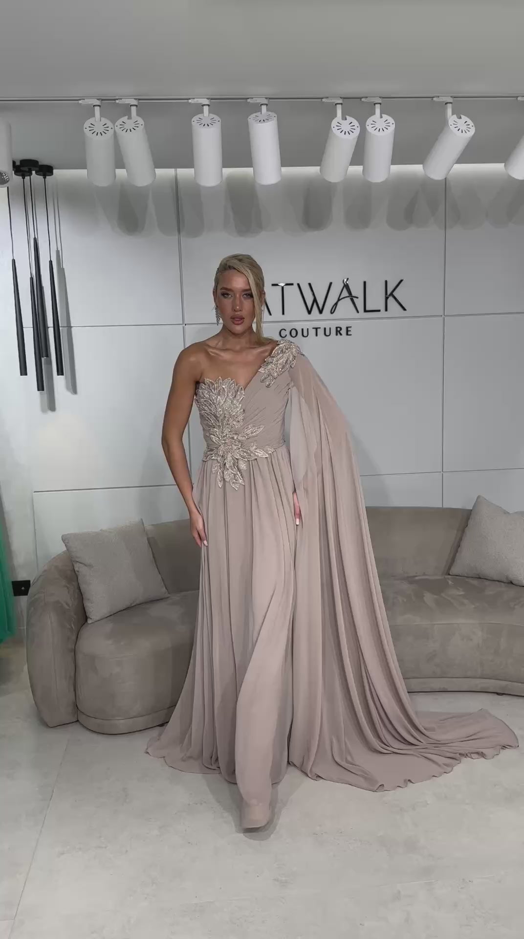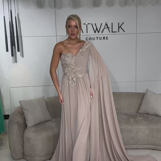 This evening gown is a masterclass in ethereal sophistication, designed to make a breathtaking statement at any high-profile event. The dress features a striking one-shoulder silhouette adorned with intricate, hand-applied floral embroidery that cascades elegantly from the shoulder across the bodice. A dramatic, floor-sweeping cape sleeve flows seamlessly from the embellished shoulder, adding a regal sense of movement and drama to the look. The ensemble is completed by a fluid, finely pleated A-line skirt that drapes beautifully to the floor, creating a romantic and commanding silhouette.