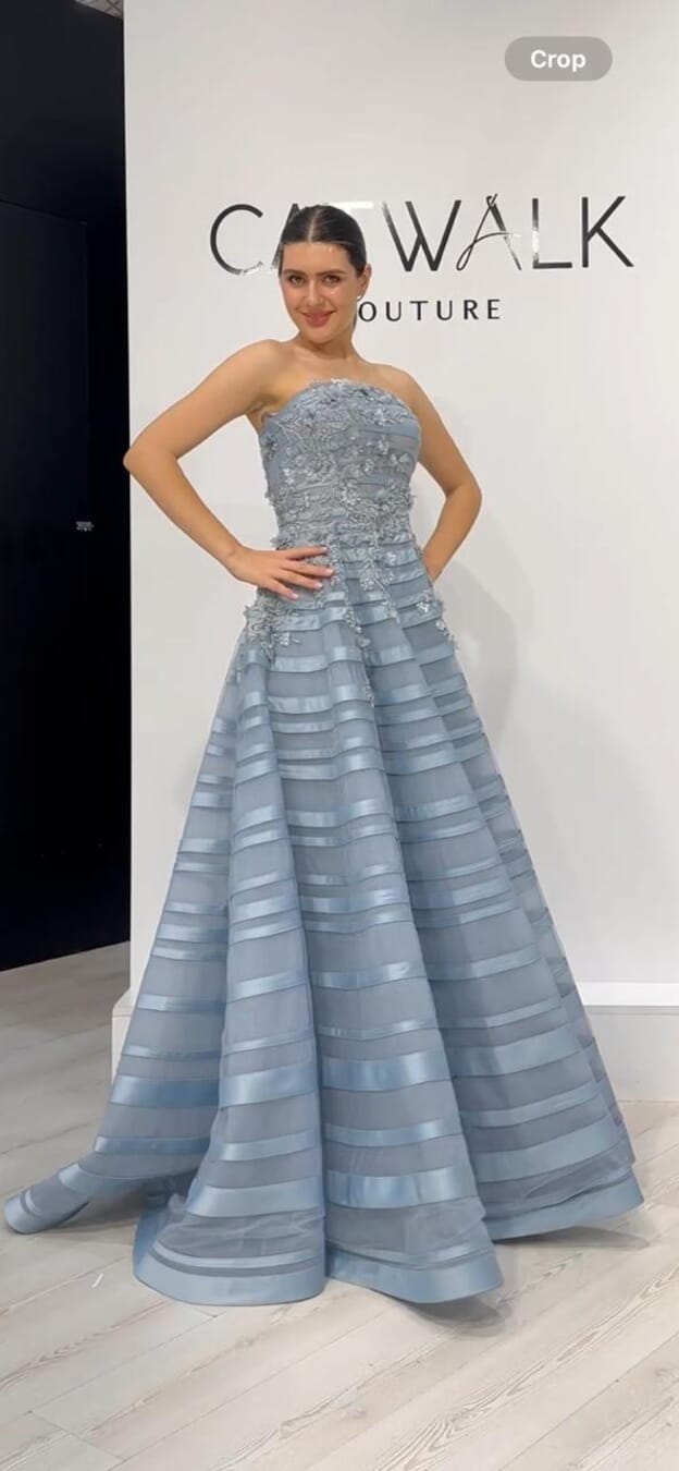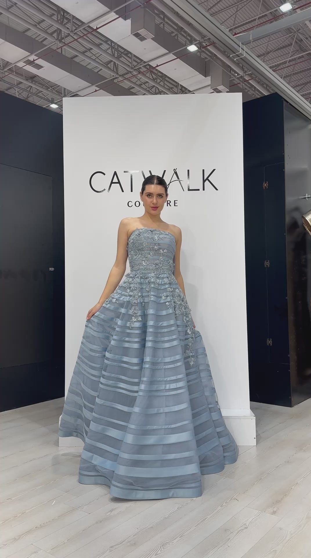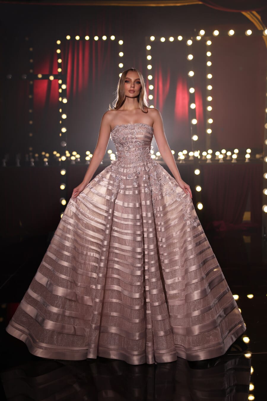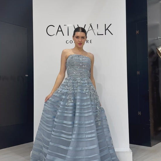 The strapless bodice is meticulously adorned with intricate floral appliqués and shimmering beadwork that tapers gracefully toward the waist to create a flattering, cinched silhouette. The true centerpiece is the voluminous floor-length skirt, featuring architectural horizontal bands of alternating textures that provide a captivating sense of structure and movement. Finished with a subtle metallic sheen that catches the light from every angle