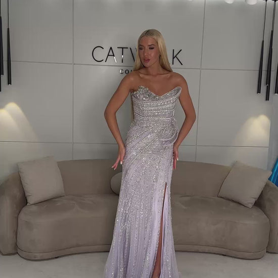 This strapless masterpiece features a structured sweetheart neckline and a form-fitting bodice, entirely drenched in intricate vertical beadwork and sequins that create a sophisticated lengthening effect. A unique, architectural fabric fold at the waist adds a modern, three-dimensional element, while a daring high thigh slit provides a touch of allure and graceful movement.