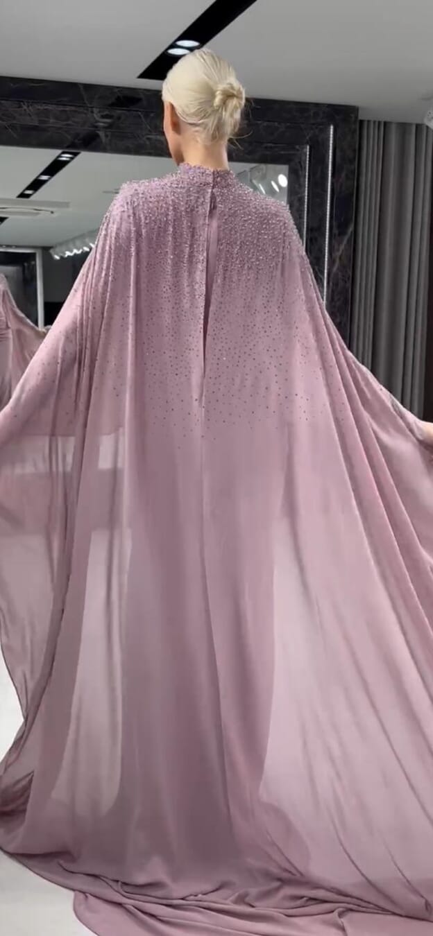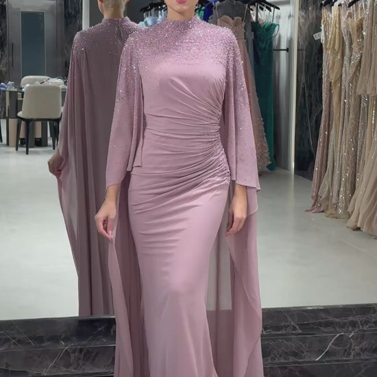 This dusty rose mauve gown features a sophisticated high-neck bodice meticulously adorned with a gradient of shimmering crystals that transition into a precision-ruched waistline for a stunning, form-flattering silhouette. The sleek column skirt is elevated by a dramatic, floor-sweeping cape attached at the shoulders, crafted from lightweight, translucent chiffon to provide ethereal movement and a touch of red-carpet drama with every step.