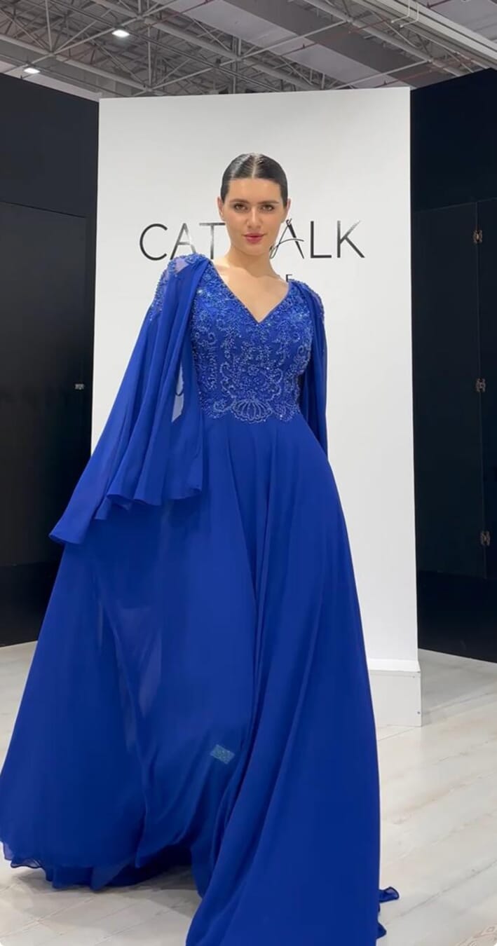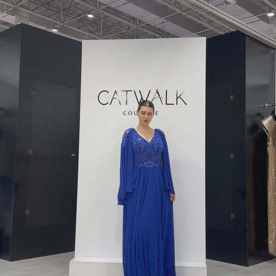 The dress features a beautifully embroidered V-neck bodice, intricately detailed with tonal scrolling patterns and shimmering beadwork that catch the light with every turn. Its most captivating feature is the butterfly cape sleeves, crafted from lightweight, translucent chiffon that adds a touch of cinematic drama and graceful fluidity to your stride. Designed with a flattering A-line silhouette, the flowing skirt drapes effortlessly to the floor, creating a regal and polished look.