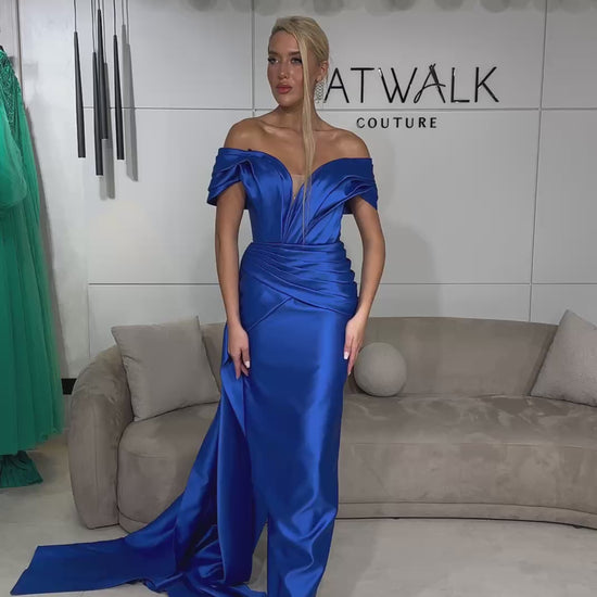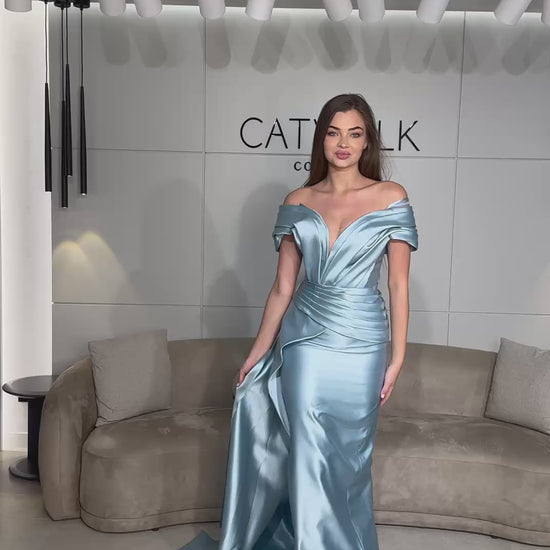 This satin gown exudes Hollywood glamour through its sculptural draping and luminous finish. The dress features a dramatic off-the-shoulder neckline with a plunging V-shaped décolletage, leading into an intricately pleated bodice that emphasizes a tailored waist. A defining characteristic of the design is the asymmetrical wrap detail at the hip, which transitions into a voluminous side train that pools elegantly on the floor, adding a sense of movement and grandeur.