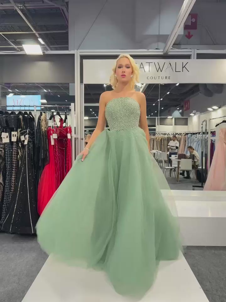 This sophisticated floor-length ballgown features a strapless, rounded bodice that is densely encrusted with crystals and shimmering beadwork, creating a rich, textured finish seashell. The sparkling embellishments subtly trail down past the waistline, transitioning into a voluminous, A-line skirt crafted from layers of airy, teal-colored tulle. The skirt's clean, sweeping silhouette offers a striking contrast to the detailed bodice, providing a sense of classic elegance and dramatic movement.