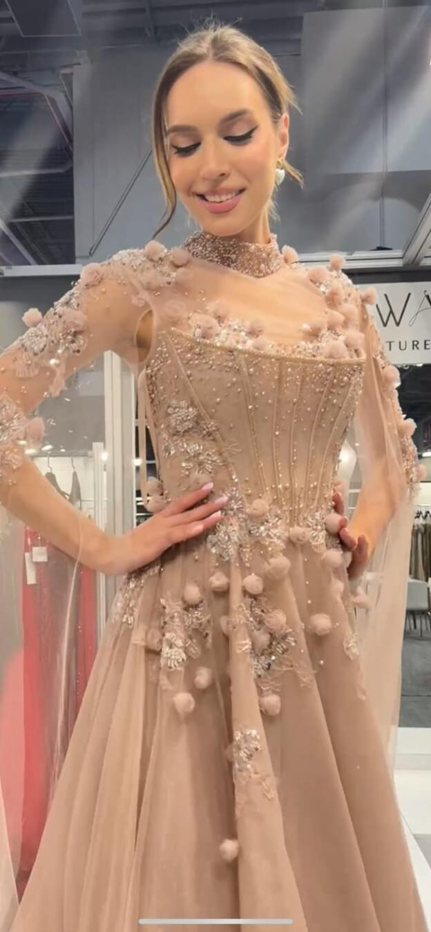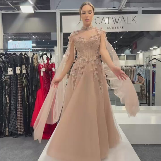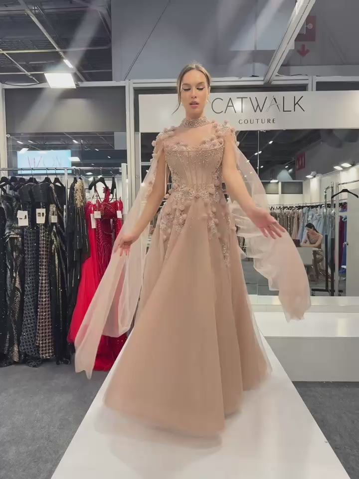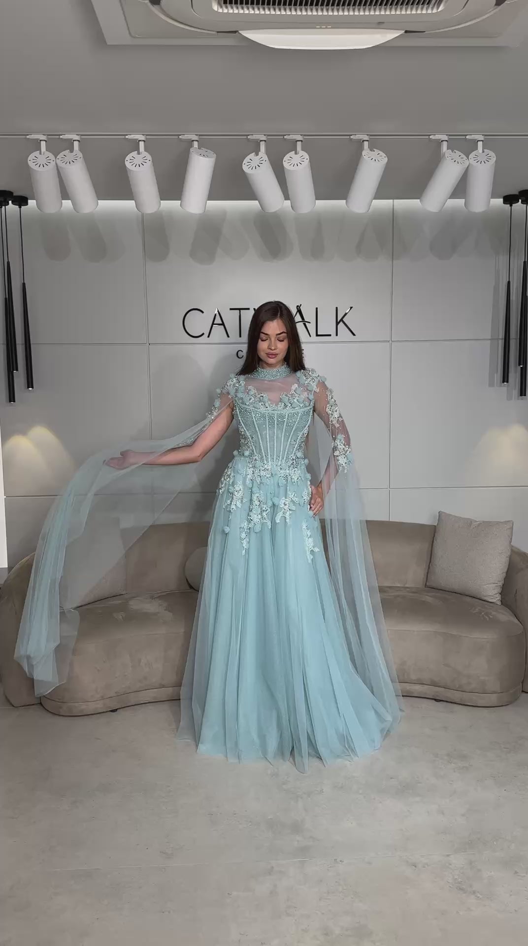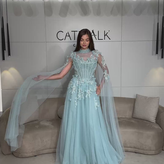 This captivating floor-length gown features a high-neck, corset-style bodice in a soft aqua blue, intricately detailed with vertical boning and encrusted with shimmering crystals. The waistline is uniquely accented by three-dimensional floral appliqués and delicate beadwork that cascade slightly onto the voluminous skirt. Crafted from layers of airy, fine tulle, the sweeping A-line skirt creates a dramatic, ethereal silhouette that flows gracefully with movement. Completing the regal aesthetic is a sheer, matching cape adorned with coordinated floral elements.