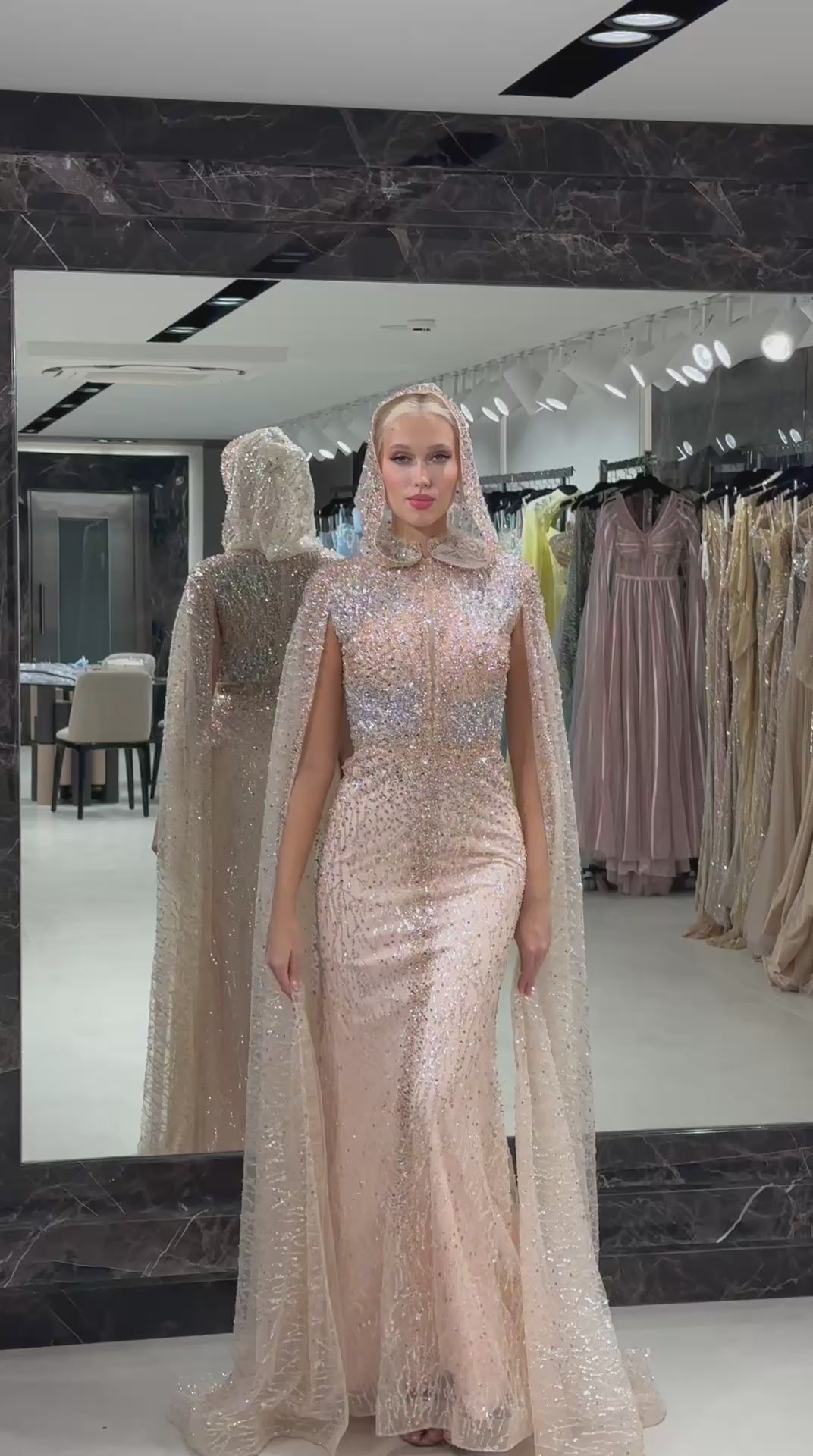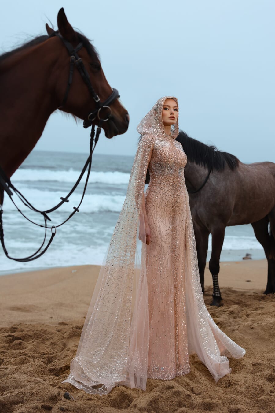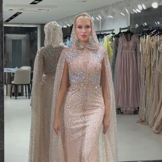 This ethereal champagne-toned gown is a breathtaking fusion of high-fashion drama and timeless sparkle. The floor-length, figure-hugging silhouette is crafted from a delicate, sheer fabric that is entirely encrusted with shimmering silver crystals and sequins, creating a radiant, stardust effect that catches every light. Its most captivating feature is the integrated hooded cape, which drapes gracefully from the head down to a floor-sweeping train, offering a majestic and avant-garde aesthetic. Designed with long sleeves and a sophisticated high neckline.