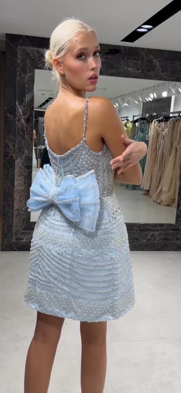 This dazzling cocktail-length dress is a captivating choice for those who want to make a brilliant, high-fashion statement. Meticulously handcrafted, the piece features a plunging V-neckline with a delicate sheer illusion panel and slim, crystal-encrusted straps that transition into a sophisticated, fitted bodice. The mini-length skirt is defined by intricate geometric beadwork and shimmering silver sequins arranged in elegant, undulating patterns that create a sculptural, high-glitz effect. The combination of brilliant crystalline elements and a modern silhouette.