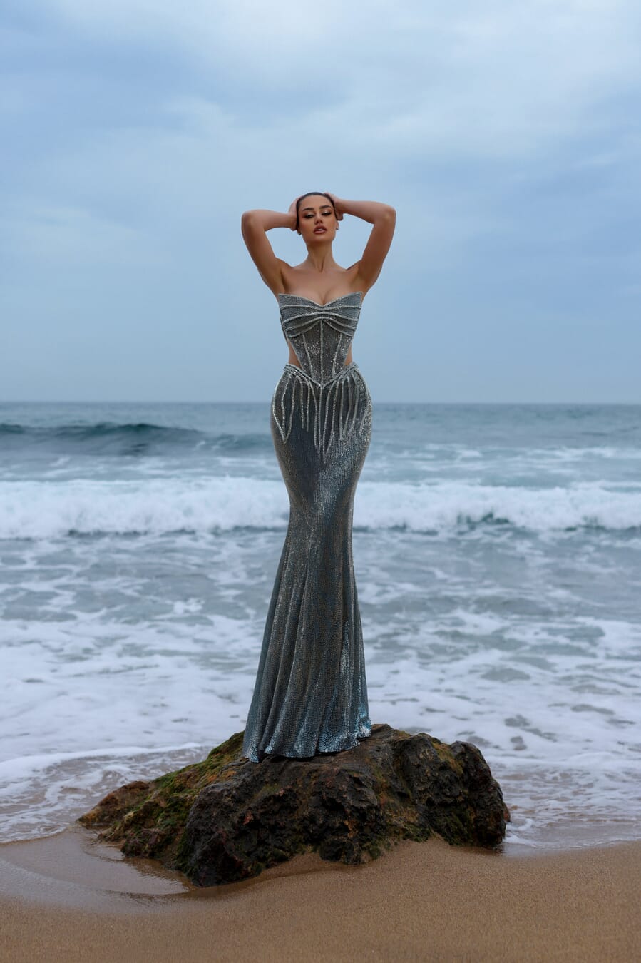 This striking floor-length evening gown is a masterclass in architectural glamour, designed with a shimmering metallic fabric that mimics the play of light on water. The dress features a structured, strapless sweetheart neckline and an intricate corset-style bodice with side cut-outs that emphasize an hourglass silhouette. Elaborate silver beadwork and sequins are arranged in dynamic vertical and radiating patterns, flowing down from the waist to create a sense of movement and texture. The skirt transitions into a sleek mermaid-style flare, pooling elegantly around the feet.