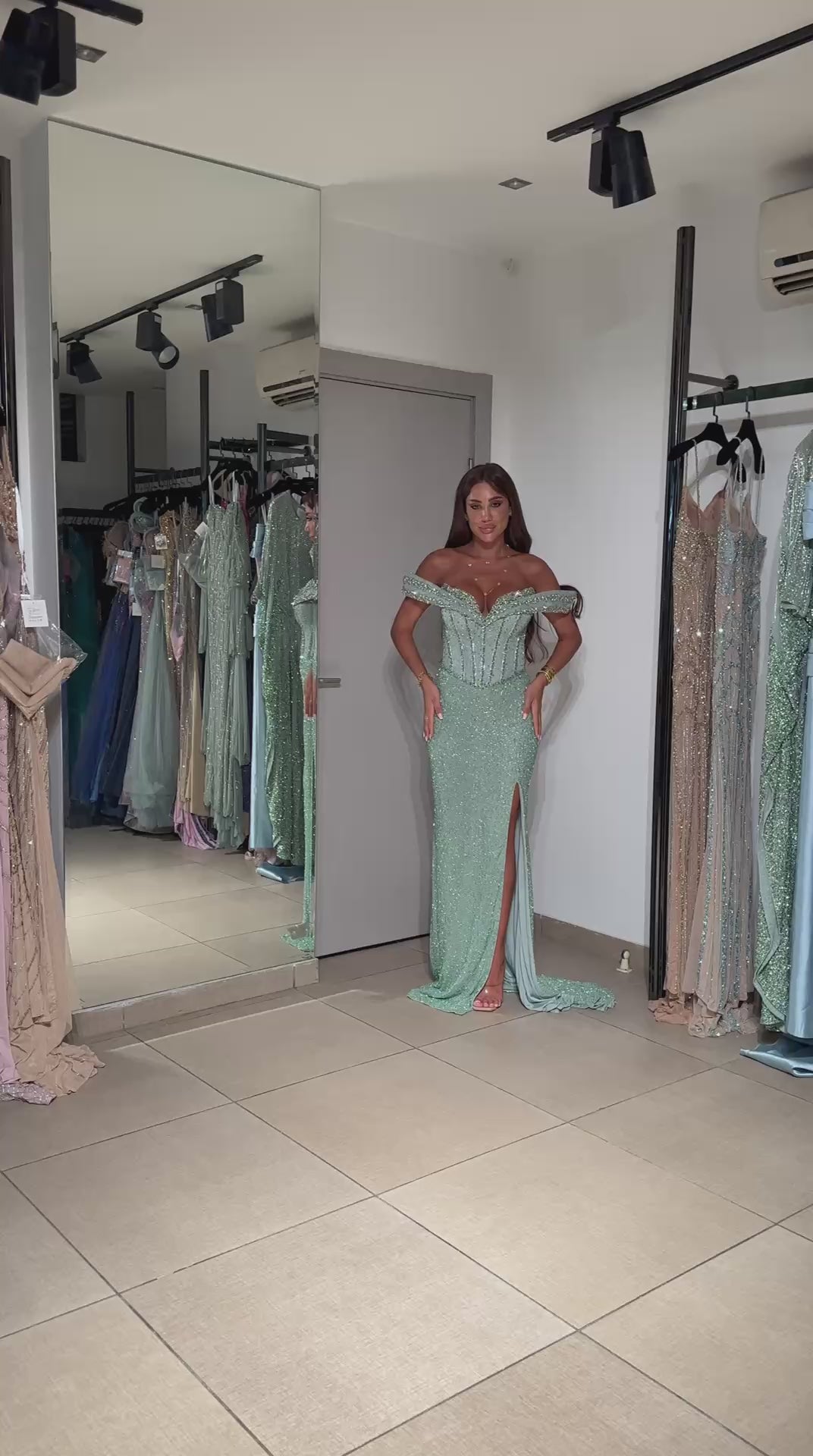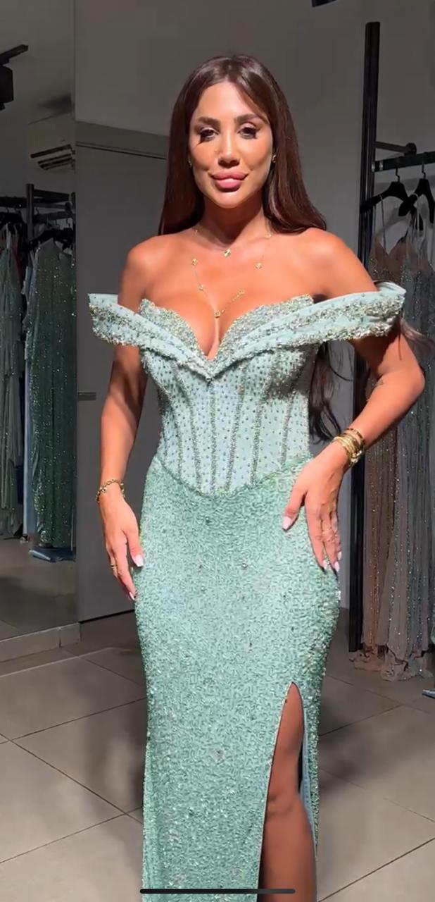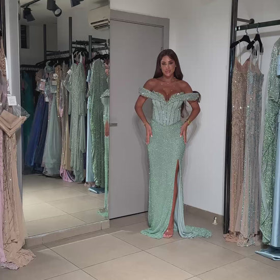 This vibrant crimson gown is a masterpiece of high-octane glamour, designed to create a powerful, statuesque silhouette. The dress features a structured off-the-shoulder bodice with a deeply contoured sweetheart neckline and visible corsetry-inspired boning, which provides a sharp contrast to the soft curves of the form. Entirely encrusted with shimmering red beads and sequins, the garment possesses a rich, multidimensional texture that radiates luxury with every movement. A daring thigh-high slit breaks the floor-length skirt, adding a provocative edge while revealing the dress's smooth inner lining.